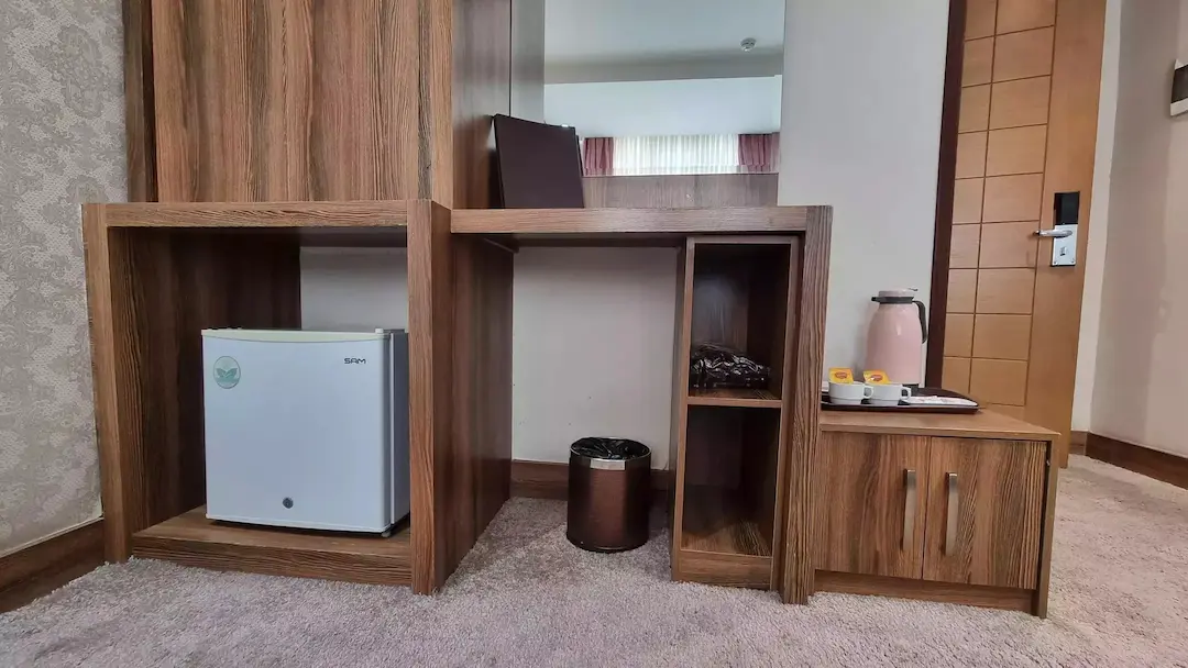 اتاقهای هتل کارن بیشتر سوئیت و آپارتمان هستن که برای خانوادهها خیلی مناسبه. چرا؟ چون هر اتاق یه آشپزخونه کوچیک داره که توش یه گاز کوچیک، یخچال، سینک و یه سری وسایل اولیه برای آشپزی هست. اینجوری میتونی هر وقت خواستی یه چای دم کنی یا یه غذای ساده درست کنی. یه تلویزیون هم داره که میتونی برنامههای مورد علاقهت رو ببینی.